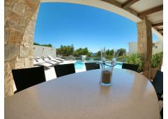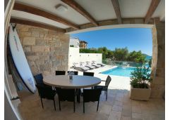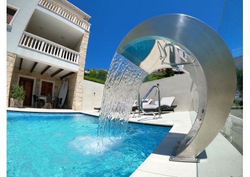 Prekrasno uređena okućnica sa bazenom od 35 m2 (dvije masažne mlaznice, i mlaznice za protustrujno plivanje te masirajući slap) i sunčalištem s koje se pruža pogled na more. Bazen ima automatsko doziranje kemije s kompenzacijskim bazenom, te specijalni pokrov uz to postoji i grijanje bazena za zimske mjesece do 30 stupnjeva.